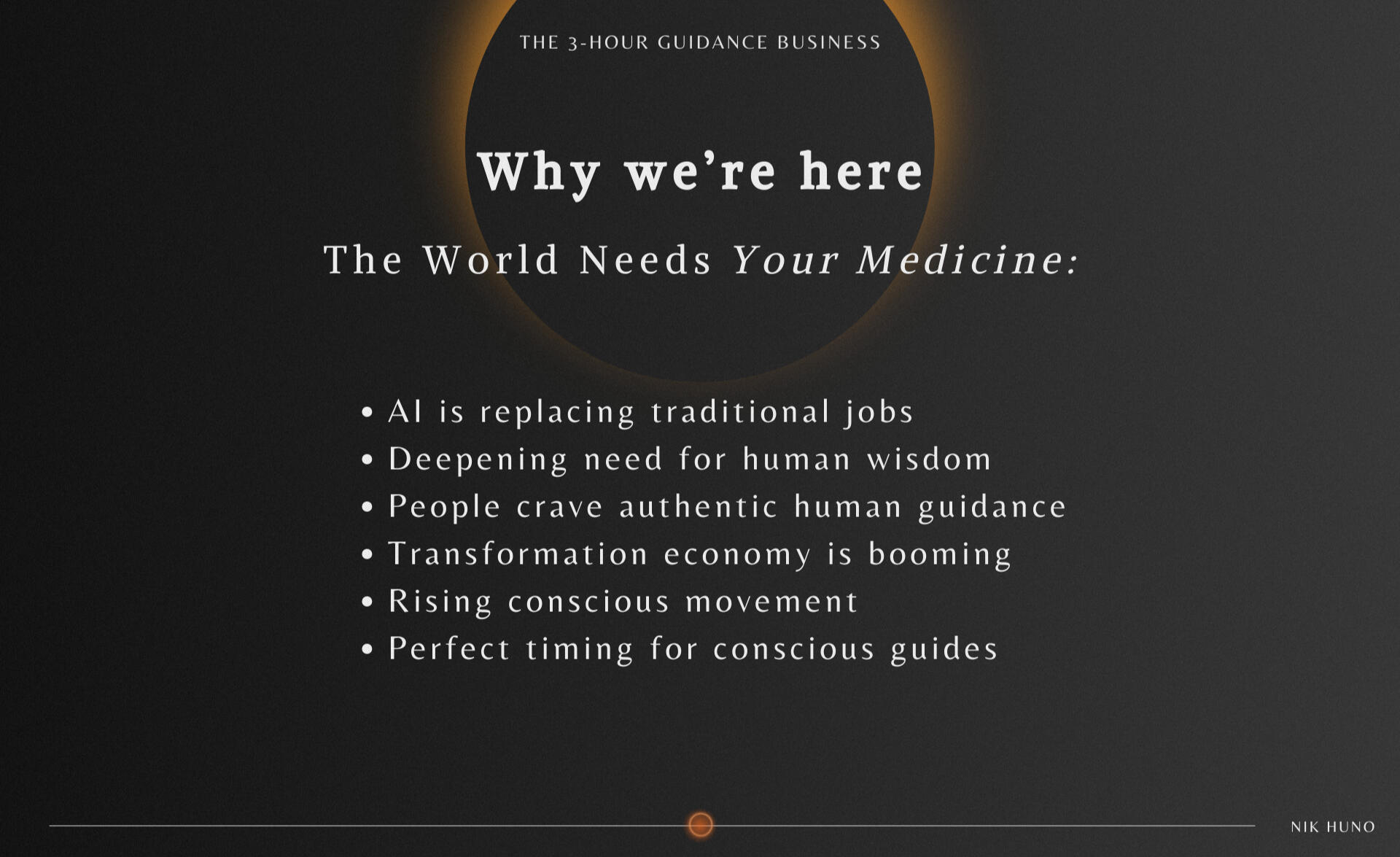 Connecting with Nik Huno is such a powerful experience.He has a unique ability to blend the most current business concepts with modern spirituality, with his remarkable ability to be fully present in every interaction.He's clearly driven by a purpose larger than himself, and this is reflected in everything he creates and in his way of serving humanity.If you need help unlocking the next level of clarity and purpose in your life, Nik is definitely your man.Riccardo Carrà